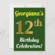 Este design convite de aniversário apresenta uma mensagem como "Georgiana's 12 de Birthday Celebration!", onde o nome pode ser personalizado, e onde o número "12" tem uma aparência falsa de ouro. Ele também apresenta um fundo de cor verde. Os detalhes do evento no verso podem ser personalizados. Poderia ser usado para convidar pessoas para a décima segunda festa ou festa de aniversário de alguém. [~Z0000121]