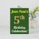 Este design convite de aniversário apresenta uma mensagem como "A Celebração de Aniversário de Jean-Paul!", onde o nome pode ser personalizado, e onde o número "5" tem uma aparência falsa de ouro. Ele também apresenta um fundo de cor verde. Os detalhes do evento no verso podem ser personalizados. Poderia ser usado para convidar pessoas para a festa ou festa de aniversário de alguém do quinto aniversário. [~Z0000121]