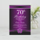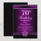 Comece a organizar sua celebração com este convite de aniversário 70 preto e roxo elegante.
