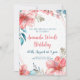 Celebre um dia especial com este design floral encantador! Flores cor-de-rosa deliciosas e folhas azuis em tons pastéis macios criam um cenário pacífico para uma festa de aniversário. Adicione seu nome e detalhes de evento a artesanato de uma bela manutenção. É uma maneira deliciosa de convidar convidados para um dia de alegria e riso!