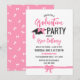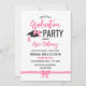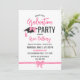 Convite de festa de formatura bonito com arcos rosados giros e detalhes de fita, fontes pretas cor-de-rosa e mate. Convite de festa de formatura feminina sem foto personalizada com o formando em um roteiro rosa brilhante, com detalhes fofos de arco em rosa, o boné de formatura adornada com um grande arco rosa.