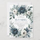 Um casamento sofisticado com um marinho azul-d'água, coroa corada floral, enfeitado com peonias, rosas e verde eucalipto em tons de azul marinho, verde e marfim. A design é aprimorada por uma caixa de cinza prateada, impressa abaixo da coroa, com layout de texto de fonte moderno. O verso do convite continua o tema com arranjo floral correspondente para um olhar coeso e elegante. Perfeito para casais que buscam eterno e papelaria de casamento clássico.