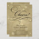 O design de convite sofisticado e elegante para festas de festas apresenta bolhas festivas de ouro de champanhe e estrelas, "Cheers!" numa escrita elegante, e uma redação que pode ser personalizada para o seu evento especial. Ouro de champanhe e esquema de cor preta.