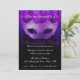 Celebração de Festa de Mascarada Azul e Roxo Convite. Um convite sofisticado e elegante com uma máscara de mascarada em tons roxos e azuis com detalhes pretos, um fundo em tons roxos e azuis com um padrão damasco sutil sobreposto em preto e tipo fancy personalizável para os detalhes da sua festa.