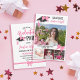 Convite para festa de formatura bonito com arcos rosados giros e detalhes de fita, fontes pretas cor-de-rosa e mate, e fotos de sua filha. Convite para garotas festas de formatura e anúncio de graduação em um, personalizado com as fotos do formando no cobrir e convite de festas atrás com detalhes fofos do arco em rosa, o boné de formatura adormecido com um grande arco rosa.