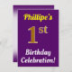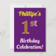 Este design convite de aniversário apresenta uma mensagem como "Celebração do primeiro aniversario de Filipa!", onde o nome pode ser personalizado, e onde o número "1rua" tem uma aparência falsa de ouro. Ele também apresenta um fundo de cor púrpura. Os detalhes do evento no verso podem ser personalizados. Pode ser usado para convidar pessoas para a primeira comemoração ou festa de aniversário de alguém. [~Z0000121]