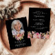 Esta celebração floral bonito de vida ou funeral ou cartão de convite a serviço memorial (disponível como um evento instantaneamente descarregável ou cartões impressos) honra lindamente a memória de um ente querido, misturando elegância com um toque de calor e personalização. A frente apresenta um fundo preto sólido com uma foto do seu amado, enquadrada em um delicado arco no topo. Abaixo da foto, um arranjo deslumbrante de flores e verde em cor-de-rosa, laranja e branco pastel, incluindo rosas e peônias, acrescenta um toque suave e reconfortante, perfeitamente contrastante com o fundo preto. As palavras "Celebrar a vida de" são elegantemente escritas, seguidas pelo nome e datas de nascimento e morte do seu amado, criando um tributo sincero que é eterno e gracioso. A parte de trás do cartão convida amigos e familiares a se reunirem em memória, com detalhes do serviço perfeitamente organizado em fontes clássicas. O fundo negro sólido continua com elementos florais mais belos no fundo, mantendo a estética coesa e marcante do cartão. Esta seção também inclui espaço para quaisquer solicitações ou informações especiais, adicionando um toque personalizado ao convite. Este cartão serve como uma forma adorável de comemorar uma vida apreciada, oferecendo conforto e graça durante um período de reflexão.