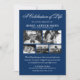Celebre a vida significativa de seus entes queridos com nossos elegantes convites de funeral personalizados. Com um fundo azul elegante e um modelo de celebração da vida moderno, ele dá um toque caloroso ao compartilhar a memória deles. O design integra graciosamente cinco fotos selecionadas do seu ente querido, criando uma homenagem delicada, porém poderosa, à sua jornada notável. Comemore os momentos inesquecíveis da vida conosco.