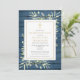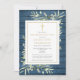 Um convite personalizado de celebração de vida e lembrança com vegetação em um fundo de painéis de madeira azul rústico. Criado por Thisisnotme©