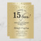 Dourada Celebração de 15 com Aniversário Convite para design elegante com folha de ouro falso brilhante. Possui fonte preta de script e diamantes de confetti. Saúde para 15 anos! Pode ser personalizado para mostrar qualquer ano de casamento. Envie-me uma mensagem se precisar de mais personalização.