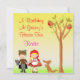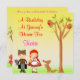 design de Chapeuzinho Vermelho com uma garota de capuz vermelha. um menino vestido como o lobo, uma raposa e uma árvore com pássaros. Coloque sobre um fundo amarelo-sol a verde-grama. Também apresenta a casa da vovó, flores e cogumelos. Excelente para qualquer celebração de aniversário! Alguns elementos de design por JW Illustrações @ meu grafico