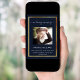 Um fundo azul escuro, uma falsa estrutura dourada. Personalize e adicione uma foto, nome, datas e texto. Texto branco.