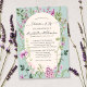 Celebração elegante e feminina de um convite ao serviço de memórias vitalícias com cores aquáticas pintadas de flores silvestres em rosa, roxo e verde.