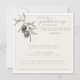 Um galho de oliveira pintado à mão enfeita esta delicada e amorosa celebração do convite à vida em tons suaves neutros