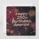 Fogos de artifício vibrantes explodem no céu escuro, celebrando uma ocasião marcante. Texto iluminado lê-se "Feliz 250º Aniversário, América," adicionando uma atmosfera festiva.