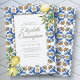 Composto por uma escrita cursiva e tipografia serifônica em botânicos folínicos verdes com folha verde-clara; tudo contra um pano de fundo de azulejos espanhóis brancos, amarelos e azuis mediterrânicos com limões amarelo-aquarela. Esta é uma comemoração antiga da vida, funeral ou convite memorial. Este é projetado pela White Oak Memorials, exclusivo para Zazzle. Disponível aqui: http://www.zazzle.com/store/whiteoakmemorials