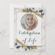 Um funeral e um convite para comemoração da vida no estilo de luxo único, com marinhos brilhantes e linhas de ouro e abertura. O convite para o memorial do funeral Apresenta um quadro elegante para colocar a foto da sua amada pessoa com um estilo botânico e floral. A design também vem com fontes clássicas e caligrafia moderna para torná-la mais bonita. O convite pode ser facilmente personalizado e se você quiser mais personalizações ou recursos extras que você possa contactar, e eu terei o prazer de ajudá-lo.
