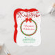 Celebração Elegante de Natal no convite de festas de Natal vermelho e branco. Fita vermelha em uma coroa verde e vermelha. O texto está pronto para ser personalizado. Hora de regozijar-se com a família, amigos e colegas de trabalho!