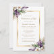 Celebração floral elegante de branco e ouro, com convite à vida, com um quadro de ouro enfeitado com orquídeas roxas e brancas e verde. Uma foto floral no fundo.