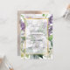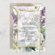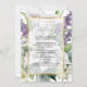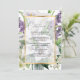 Celebração floral elegante, roxa e branca, de um convite à vida com detalhes do evento dentro a gold frame num fundo floral de flores roxas, lírios, orquídeas e verde. Uma foto atrás.