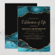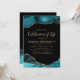 Convite à comemoração personalizada, com um fundo preto na moda, bordas elegantes de mármore teal agate, e uma celebração moderna de modelo de vida que é facilmente personalizada. Todos os estilos de fonte, tamanhos e cores podem ser alterados clicando no link personalizar depois de personalizar.