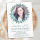 Funeral Moderno Eucalyptus Memorial / Celebração Do Convite À Vida. Estes convites para funeral de simpatia apresentam uma foto em um design de eucalipto verde. Personalize esta celebração do convite para o funeral de vida com as fotos, nomes e datas de seus entes queridos, detalhes do evento. COPYRIGHT © 2021 Judy Burrows, Black Dog Art - Todos Os Direitos Reservados. Celebração De Fotos De Boas-Feiras Do Convite À Vida
