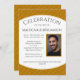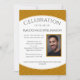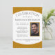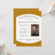 CELEBRAÇÃO DO Funeral Memorial Moderno DO LIFE Foto Convite com FOTO TEMPLATE e texto PERSONALIZÁVEL. Há um texto de Escritura baseado em 2 Corintianos 5:8, que diz: "Estamos confiantes, eu digo, e preferencialmentes felizes por não estarem presentes no corpo e presentes com o Senhor". O esquema de cores de fundo é uma laranja quente queimada com tipografia de ouro. O texto de fundo diz IN LOVING MEMORY (MEMÓRIA DE APROVEITAMENTO) em um padrão de título. Outras cores disponíveis.