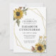Composto por uma escrita cursiva e uma tipografia serif; Tudo contra um pano de fundo de madeira na parte de trás do cartão e flores girassóis felizes.