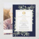 Um elegante convite de celebração judaica da vida funeral lembrança com folhagem botânica em aquarela sobre um fundo azul-marinho. Criado por Thisisnotme©