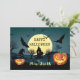 Celebração Noturna de Halloween, Carnaval, Cartão de Saudação Trendy, Cartão de Convite, Cartão Postal, Obrigado, Salve a Data - Cartão MAGIC Halloween Night Greeting, Cartão de Convite, Cartão postal, Cartão Postal, Salve a Data - Paisagem de Halloween, Lanterna de Halloween Pumpkin, Bat, Web Spider, Logotipo de Bruxa Magica de Halloween, Casa, Lua e Céu, Feiticeiro de Halloween, Inspiração, Feita à Mão. Símbolos da Noite Mágica do Halloween Ilustração com opção Personalizar Alteração de Texto