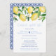 Convites de festa pós-casamento "celebre conosco" com limões aquarela vibrantes e folhas verdes brilhantes com lindas flores, complementados por azulejos azuis cobalto e branco no verso.
