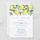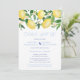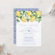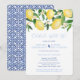 Convites de festa pós-casamento "celebre conosco" com limões aquarela vibrantes e folhas verdes brilhantes com lindas flores, complementados por azulejos azuis cobalto e branco no verso.