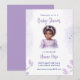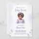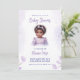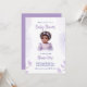 Este convite botânico personalizável apresenta uma paleta de cores roxas suaves e uma imagem em aquarela de uma menina de pele morena com um laço no cabelo encaracolado. A adorável menina está usando um vestido roxo, combinando com os outros elementos do convite.