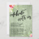 Convide sua tribo para celebrar seu casamento recente com este cartão bonito. A fundação está coberta por uma imagem que mostra madeira rústica verde-clara. Usando uma letra casual e moderna de escrita manual, criei sobreposições gráficas que leram "celebrar conosco" e "e". A mesma fonte foi usada para criar a palavra "amor", que foi colocada atrás. Este tipo de letra foi emparelhado com uma fonte sans-serif limpa utilizada para compor os seus detalhes. O gráfico da palavra "e" pode precisar ser reposicionado, dependendo do comprimento de seus nomes. Use os campos modelo fornecidos para personalizar o design. Nos cantos de cada lado, coloquei gráficos de sotaque retratando flores suteis e de cor d'água. Se você quiser personalizar ainda mais, movendo qualquer detalhe em outro lugar, girando os acentos florais, mudando as fontes ou os tamanhos, basta clicar no link fornecido e editar o design conforme desejar. Eu adicionei todas as camadas separadamente e elas estão desbloqueadas para dar a você um controle significativo de design. // Por favor, não hesite em contactar-me para solicitar pedidos especiais ou assistência com vista à personalização. 100 //