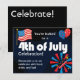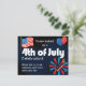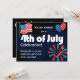 Convite animado, brilhante e explosivo em 4 de julho com fogos de artifício vermelhos brancos e azuis, fogos de artifício, balões com padrão estelar, bandeira americana, com fundo azul preto e marinho e fonte de texto retroativo funky. Adicione seu quarto personalizado de churrasco, piquenique, festa ou texto de celebração de julho.
