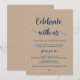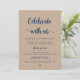 Lindo cartão de anúncio de casamento simples rústico moderno, kraft marrom, tema de casa de fazenda, fonte azul marinho, (Celebre conosco). Perfeito para o seu casamento e festa de celebração pós-casamento. Adicione seus detalhes na fonte / letra correspondente.
