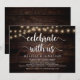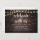 Celebre conosco, Anúncio de Casamento Íntimo / Cartão de Convite, em Madeira de Fazenda Rústica, design de Luzes de Corda. Isto é perfeito para a recepção do seu casamento e festa de celebração pós-casamento. Adicione seus detalhes em fonte / letra correspondente.