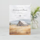 Este convite de casamento apresenta um tema pastoral sereno com uma ilustração em estilo aquarela de um celeiro rústico colocado contra colinas onduladas. A paleta de cores inclui azuis suaves, cinzas e tons terrosos, criando uma atmosfera calma e convidativa. Fontes script e serif elegantes são usadas para o texto, que é organizado em um layout centralizado para melhorar a legibilidade. O design captura a essência de um ambiente rural com sua representação realista e estilizada, tornando-o perfeito para casais que buscam uma estética charmosa e simples para o seu dia especial.