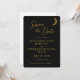 Anuncie seu dia especial com estilo com este cartão de Save-the-Date celestial, apresentando um fundo preto com sotaques de lua e estrelas douradas cintilantes. Fontes elegantes de caligrafia e serifa destacam seus nomes, data do casamento e local em um tema cósmico sofisticado. Perfeito para casamentos celestiais, cerimônias sob as estrelas ou celebrações noturnas elegantes, este cartão de Save-the-Date personalizável combina perfeitamente com convites, cartões de RSVP e notas de agradecimento correspondentes. Impresso a 350 DPI em papel cartão premium para detalhes e qualidade impressionantes.