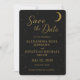Anuncie seu dia especial com estilo neste cartão de Save-the-Date celestial, apresentando um fundo preto com sotaques de lua e estrelas douradas cintilantes. Fontes elegantes e serifadas destacam seus nomes, data do casamento e local em um tema cósmico sofisticado. Perfeito para casamentos celestiais, cerimônias sob as estrelas ou celebrações noturnas elegantes, este cartão de Save-the-Date personalizável combina perfeitamente com convites, cartões de RSVP e notas de agradecimento correspondentes. Impresso a 350 DPI em papel cartão premium para detalhes e qualidade impressionantes.