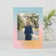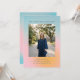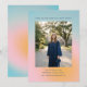 This graduation party invitation has a soft pastel gradient background in blue, pink, and peach with a large photo of the graduate front and center and all the party details in clean blue lettering above and below.