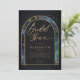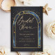A stunning double gold boho arch frame beautifully highlights an inner watercolor painting of a starry night, featuring a deep blue and navy overlay that looks like celestial waters with bright spots of royal blue, accented with traces of pink and yellow. This design showcases intricate celestial elements: the sun, the moon, the chalice, and twinkling constellations and stars. All set against a rich deep navy blue and gold color scheme (please note, the gold is a digital effect, not real foil!), this invitation perfectly blends astrology, horoscope, and zodiac vibes. It's a truly unique bridal shower invitation for a modern bride seeking an enchanted bridal shower or a boho celestial event. Set the tone for an unforgettable celebration filled with cosmic wonder!