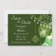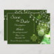 Este encantador anúncio do casamento "Salve a data" apresenta um belo design Celta com pavimentas e luzes encantadoras em tons de verde e branco. É excelente para qualquer casamento e perfeito para irlandeses e Ruas. ^
