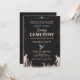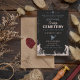 O convite apresenta um design minimalista com fundo preto e sotaques vermelhos e azuis empoeirados. O layout é simples e limpo, com o texto centrado e os gráficos dispostos simetricamente. O efeito geral é assustador e inquietante, com o forte contraste entre o fundo escuro e os elementos mais leves criando um sentido de profundidade e mistério.