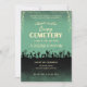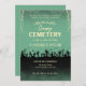 O convite apresenta um design de inspiração vintage com fundo de pinheiro polido e texto de sotaque loiro. O layout é simétrico, com uma imagem central de um cemitério assustador e uma silhueta de zumbis no primeiro plano. A estética geral é rústica e estranha, criando um senso de antecipação para o evento.