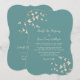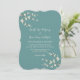Uma ilustração original de lindas flores de cerejeira brancas creme marfim ou flores de sakura da primavera com galhos marrom claro sobre um fundo verde turquesa. Este é um convite de casamento moderno de dupla face para o dia do casamento / cartão de recepção de jantar de casamento.