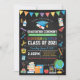Convite de formatura colorida para a classe do jardim de infância, edite para qualquer ano. Este design apresenta um pano de fundo do quadro e material e elementos coloridos para a escola. Personalize este design para a sua classe do jardim de infância! Também disponível para a pré-escola e 5º ano!