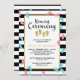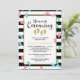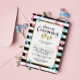 Convite para cerimônia de nomeação para irmãos gêmeos com pegadas em ouro, rosa e azul espalhadas sobre um fundo listrado preto e branco. A cerimônia de nomeação é escrita em um roteiro encantador. Adicione os nomes dos seus gêmeos e os detalhes da cerimônia de nomeação.