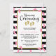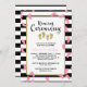 Concurso de cerimônia de nomeação para meninas gêmeas com pegadas bonitas em ouro e rosa espalhadas por um fundo listrado preto e branco. A cerimônia de nomeação é escrita em um roteiro encantador. Adicione os nomes das suas garotas e os detalhes da cerimônia de nomeação.