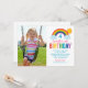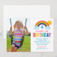 Este convite de festa de aniversário alegre com tema de arco-íris apresenta um fundo branco crocante com um arco-íris brilhante, sol dourado e nuvens fofas arqueando sobre um espaço para a foto de seu filho. Letras coloridas de "Aniversário" em negrito fazem uma declaração divertida, enquanto a tipografia cursiva e impressa exibe os detalhes da festa. Todo o texto é totalmente personalizável para combinar com o dia especial do seu pequeno.